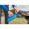 Nach dem Abnehmen der oberen Kappe des Hauptdeckels gelangt man zu dem speziellen Ventil, das nach dem Aufhängen des Beutels z.B. an einem Baum (Riemen im Lieferumfang enthalten) auch als Wasserhahn dienen kann.