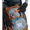 Auch wenn die Ausrüstung am Rucksack befestigt ist, kommt man leicht an alle Gegenstände im Inneren heran. Das helle Innenmaterial verbessert die Übersichtlichkeit und erleichtert die Orientierung im Inneren des Rucksacks. An der Innenseite befindet sich außerdem eine Schnalle mit einem separaten Fach zur Befestigung eines Wasserbehälters. Der Rücken ist mit einem schneeabweisenden Softshell-Material überzogen. Das Hauptfach ist auch über den oberen Reißverschluss zugänglich.